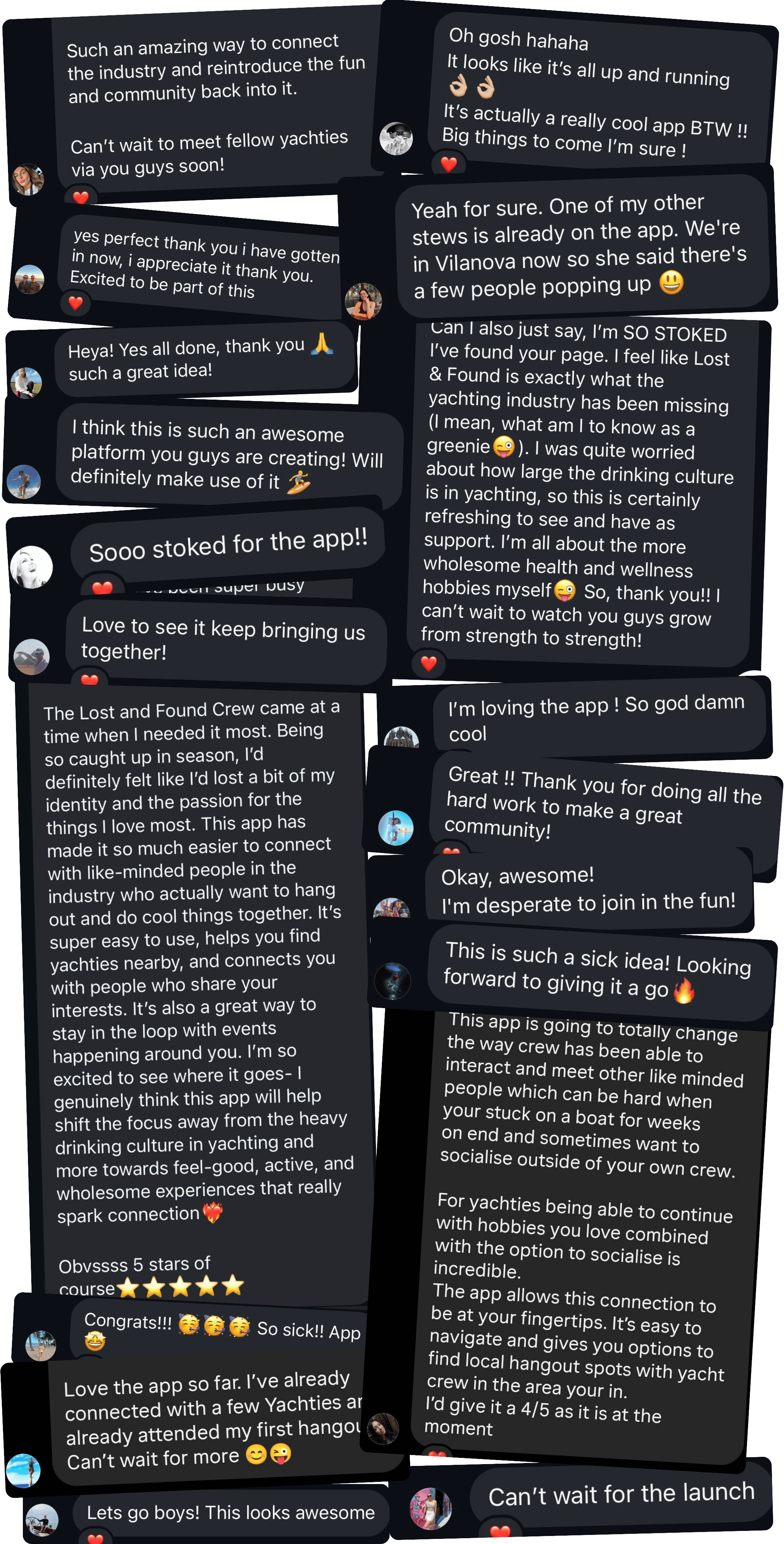 The Lost and Found Crew came at a time when I needed it most. Being so caught up in season, I definitely felt like I'd lost a bit of my identity and the passion for the things I love most. This app has made it so much easier to connect with like-minded people in the industry who actually want to hang out and do cool things together. I genuinely think this app will help shift the focus away from the heavy drinking culture in yachting and move towards feel-good, active, and wholesome experiences that spark connection.